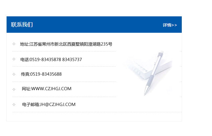 地址:常州市新北區友邦商務大廈1幢16、17層  電話:0519-85101652  傳真:0519-85112595  郵編:213022  網址:www_cz-jiayue_cn.bjzhuoqi.com  郵箱:xiajifengaa@163.com